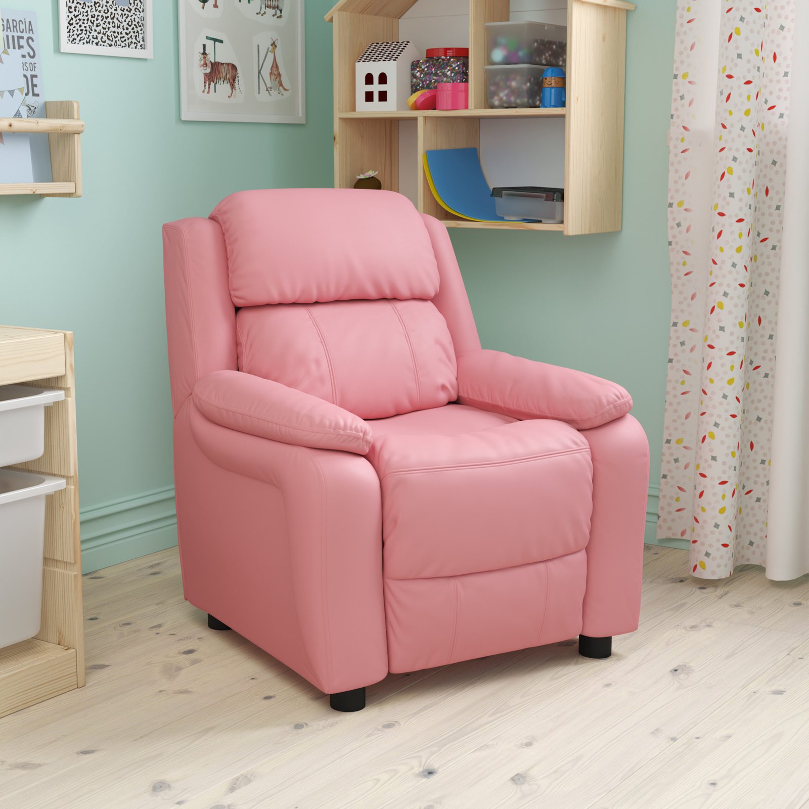 Flash Furniture Deluxe Heavily Padded Contemporary Pink Vinyl Kids Recliner with Storage Arms [BT-7985-KID-PINK-GG]