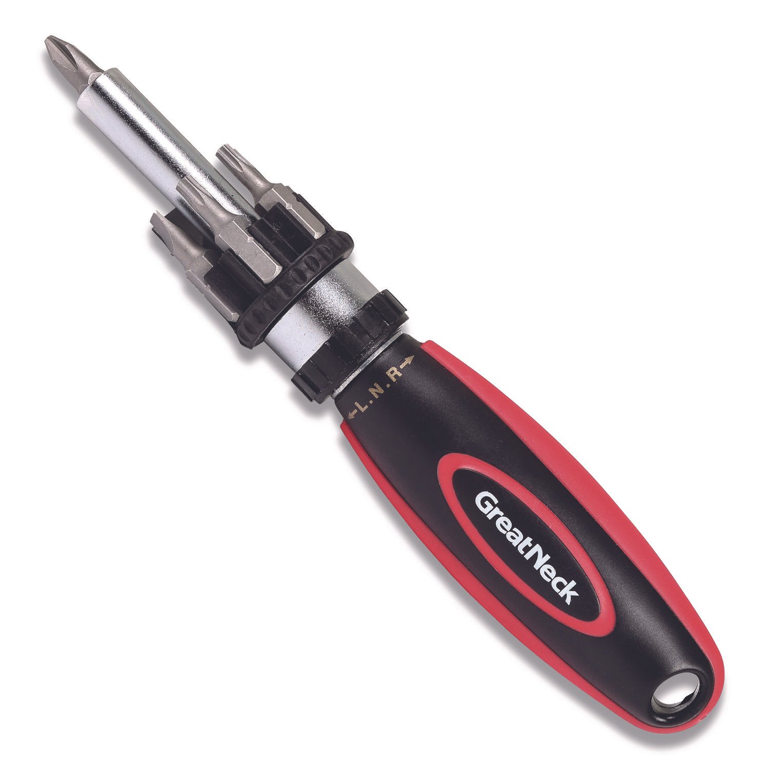 Great Neck Ratcheting Screw/Nut Driver Set, Phillips/Slotted/Star Bits, 7″ Long, Black/Red
